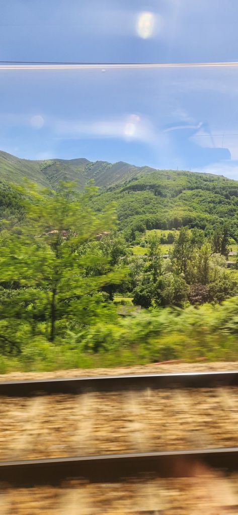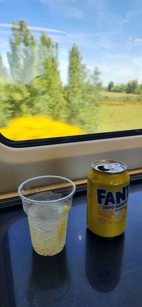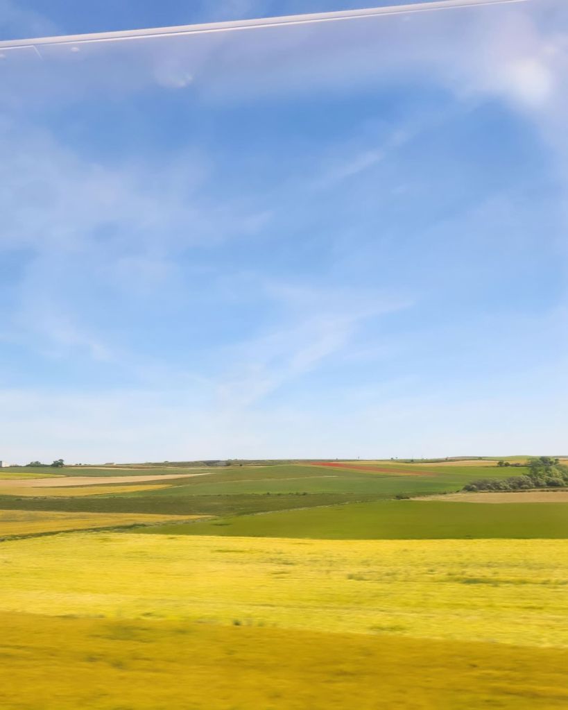 Once the train started moving we were quickly out of Madrid and into the countryside. Initially sparse trees and difficult terrain, gradually making way for rolling pastoral fields. My favourite discovery was that through Castille y Léon the track was lined with poppies and wild flowers somehow extra beautiful as they sprung up between wire fences and embankments.