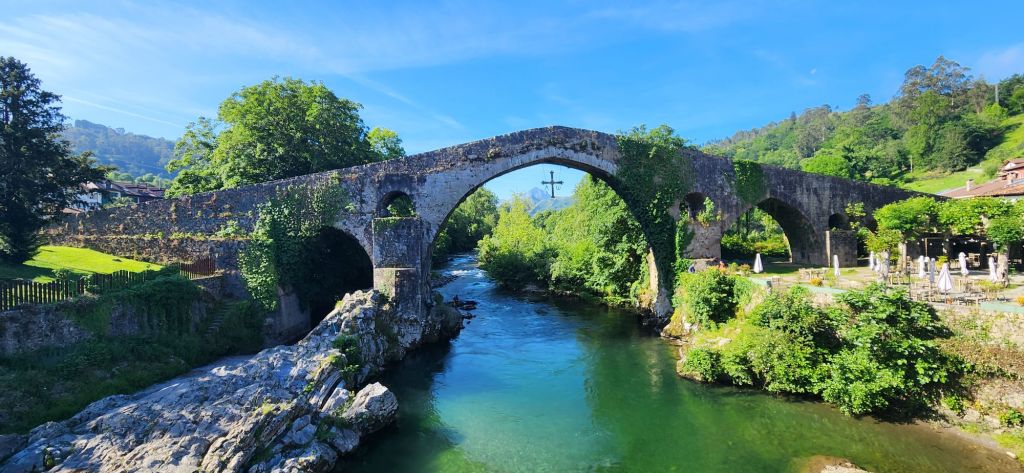 Our first stop was the non Roman Puente Romanico in Cangas de Onis which crosses the river Sella. We emerged from beautiful ghostly fog (new word for me – nibiela) to the high arched cobbled bridge over the deep blue green water. Salmon fishermen were along the rocks to the side and it was surreally beautiful just metres from the main road.